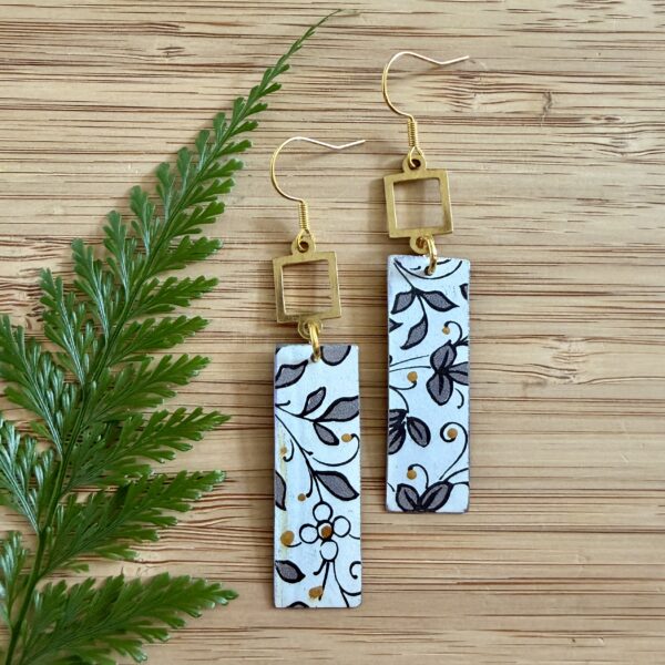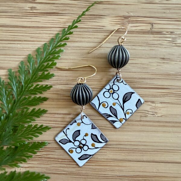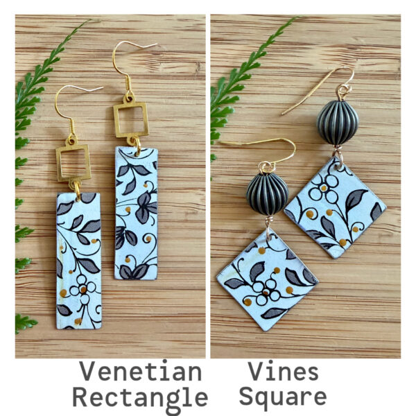 Super popular, neutral yet chic ‘Venetian Vines’ Created with ‘zero waste’ in mind, from a vintage tin serving platter, these repurposed, super light and carefree vintage tin earrings will become your new favorites. Handcrafted from a vintage or modern up-cycled steel tin container. Each piece is hand cut, filed, sanded and shaped to form a one of a kind adornment.